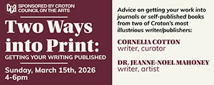 Two Ways into Print: Getting your writing published Advice on getting your work into journals or self-published books from two of Croton’s most illustrious writers/publishers: Cornelia Cotton and Dr. Jeanne-Noel Mahoney.